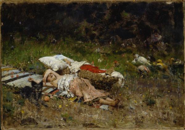 Dipinto a olio di piccole dimensioni di Francesco Paolo Michetti, raffigurante una ragazzina sdraiata nell'erba, con accanto un cagnolino nero e, sulla destra, una culla di vimini in cui è addormentato un neonato.