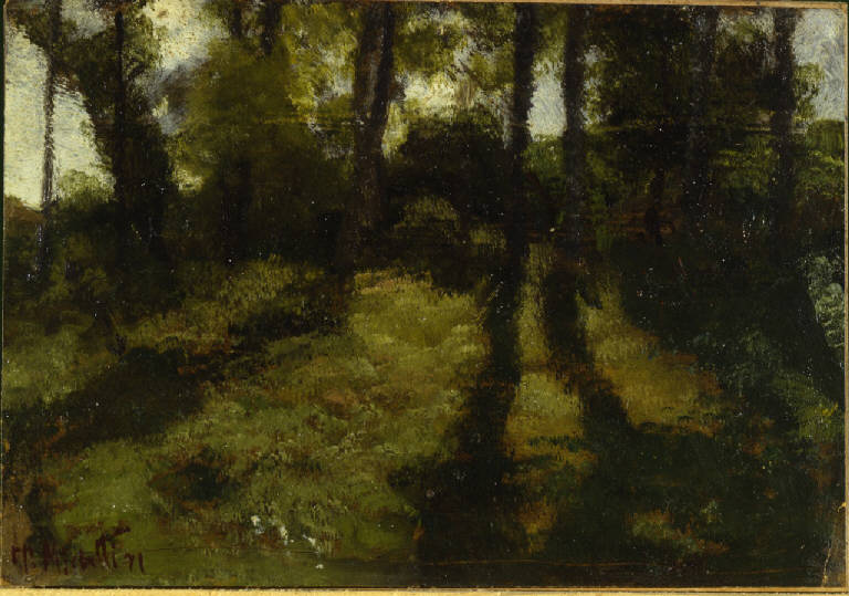- NOTIZIE STORICO CRITICHE Il quadro è giunto al Museo Nazionale della Scienza e della Tecnica nel 1957 con il lascito della collezione di Guido Rossi, che di Michetti possedeva sette dipinti (nn. Inv. 1830-1835, 1837) molti dei quali inseriti, come questo, in una cornice commissionata da Rossi al laboratorio di Ettore Zaccari.\nL'opera è datata 1871 e appartiene quindi alla giovinezza del pittore: si tratta di un piccolo studio su un bosco, ripreso con taglio molto ravvicinato, che elimina qualunque intento descrittivo, per cogliere soprattutto i rapporti chiaroscurali del soggetto. \nA studi di questo genere Michetti si dedicherà anche negli anni successivi, spesso servendosi anche della fotografia, di cui rimangono numerose testimonianze in cui indaga angoli di boschi, macchie, gruppi d'alberi sempre con taglio ravvicinato e forti contrasti di luce (cfr L'ultimo Michetti 1995, pp. 104-128).