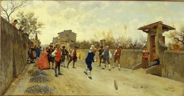 Dipinto a olio di piccole dimensioni di Raffaello Sorbi, raffigurante un gruppo di persone in abito settecentesco in strada, di cui quello al centro ha lanciato il disco di legno della ruzzola.