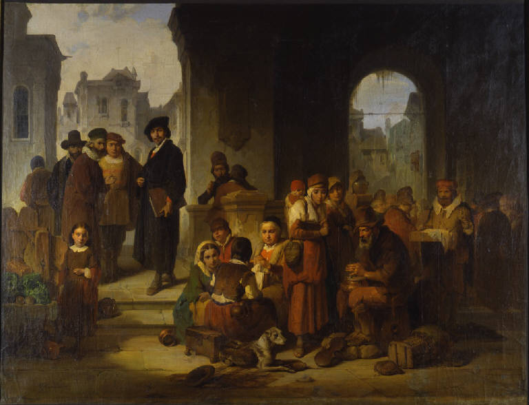 - NOTIZIE STORICO CRITICHE Il dipinto è giunto al Museo Nazionale della Scienza e della Tecnica con il lascito del 1976 di Paolina Farnesi, vedova di Aldo Mazza, di cui eseguiva la volontà di lasciare al museo un nucleo di opere proprie e del nonno Giuseppe Mazza, oltre che di altri artisti dell'ottocento lombardo, secondo un progetto accarezzato almeno dal 1958, dopo aver organizzato a Milano nel 1942 una mostra a loro dedicata, a cui prese parte anche quest'opera.\nIl dipinto è firmato e datato 1856, anno in cui venne presentato all'annuale esposizione di Brera a Milano, dove fu notato da Giuseppe Rovani, che ne lodò l'accuratezza di composizione ed esecuzione, notando acutamente quanto l'opera fosse in bilico tra pittura di storia e di genere (Rovani 1856, snp). Il titolo completo con cui fu presentato -Rembrandt tra gli Ebrei di Amsterdam, che va in traccia di tipi e modelli per i suoi studi popolari- chiarisce che il soggetto si riferisce agli studi dal vero compiuti da Rembrandt nel ghetto ebraico di Amsterdam.\nCommissionata dal marchese Cesare Cagnola, come il pendant Masaniello (inv. 8478), l'opera rimase nella collezione di famiglia fino al novecento, quando Guido Cagnola donò i due dipinti ad Aldo Mazza per formare una raccolta di opere dei Mazza, che sarebbe poi stata donata al museo.\nDi dimensioni e caratteristiche uguali al suo pendant, l'opera ne condivide il cattivo stato di conservazione, offuscata dallo sporco, da cadute di colore e dall'ingiallimento delle vernici, che ne pregiudicano la lettura.