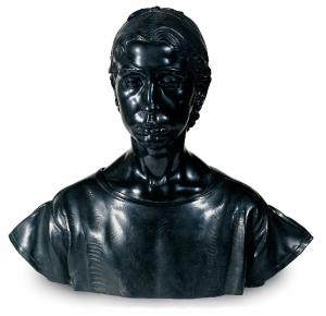 Busto di Attilio Selva in basalto nero al naturale raffigurante una giovinetta, con basamento in legno sagomato e dorato.