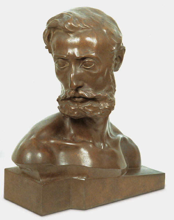 Busto in bronzo patinato di Arrigo Minerbi al naturale, raffigurante il ritratto dell'autore, con la testa girata verso sinistra.