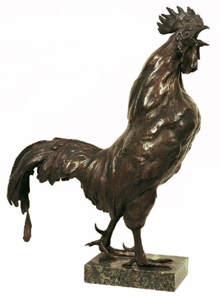 Statua in bronzo di Arrigo Minerbi rappresentante un gallo a grandezza naturale, su base di marmo verde.