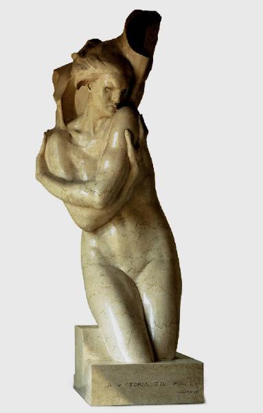 Statua in marmo di dimensioni naturali di Arrigo Minerbi, raffigurante una figura femminile alata nuda, personificazione della Vittoria, tagliata all'altezza delle ginocchia.