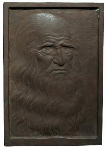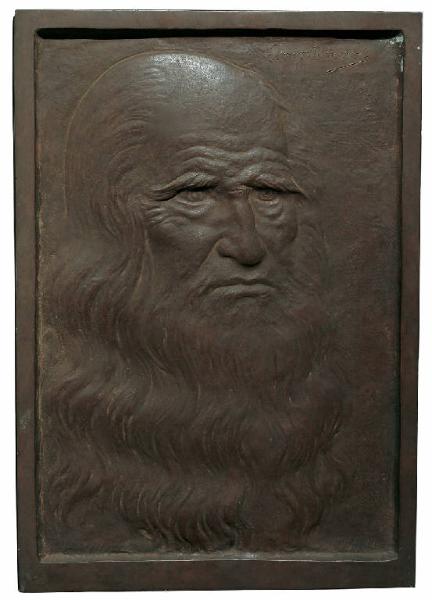 Rilievo in bronzo di forma rettangolare di Arrigo Minerbi, raffigurante il volto di Leonardo da Vinci in avanzata età.