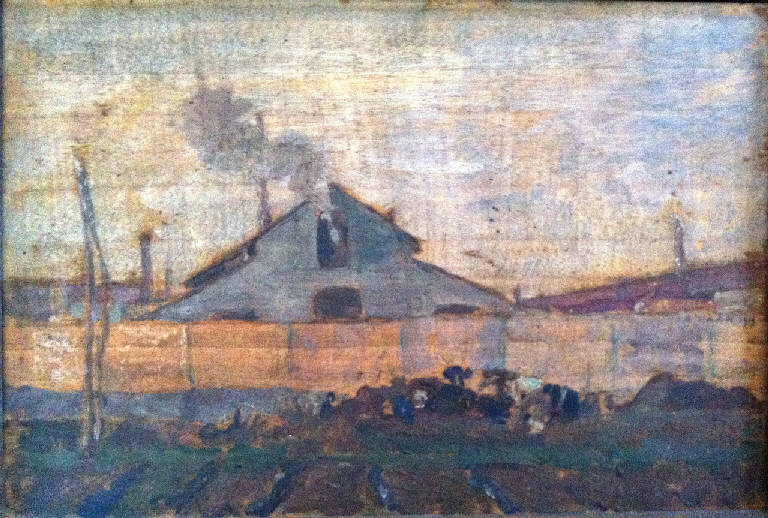 Dipinto a olio di piccole dimensioni di Aldo Carpi, raffigurante una veduta con una fabbrica, montato in ua cornice originale con altri due dipinti dell'autore.