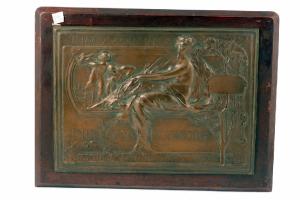 Targa in bronzo rettangolare montata su base in legno, diploma d'onore per l'esposizione di Milano del 1906, raffigurante una donna seminuda seduta verso sinistra con due amorini e una pianta di alloro sulla destra.