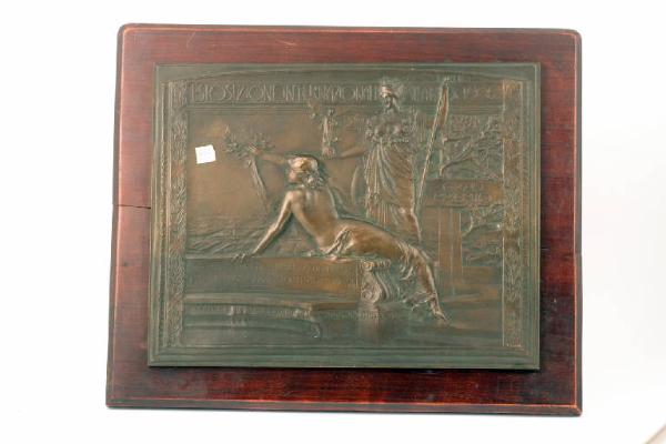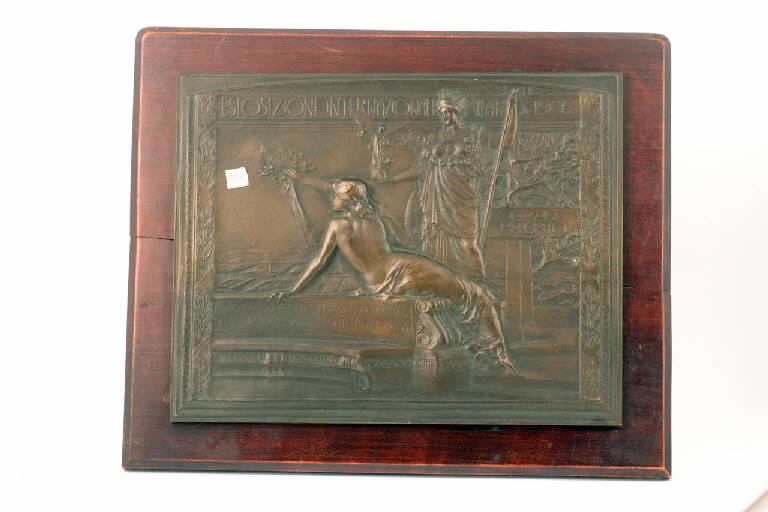 Targa in bronzo rettangolare montata su base in legno, gran premio per l'esposizione di Milano del 1906, raffigurante una donna seminuda appoggiata a un sedile semicircolare, che tiene in mano una corona d'alloro, girata di spalle verso sinistra davanti a una figura di Minerva in piedi, che tiene nella mano destra una vittoria alata.