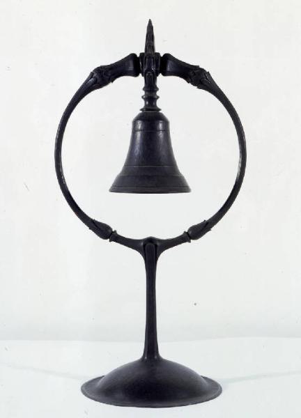 Lume in ferro battuto a forma di campana, con base circolare, stelo e anello di sostegno