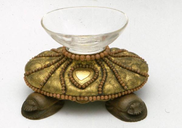Coppetta in cristallo con base in argento dorato, cesellato e decorato con piccoli grani di corallo. Poggia su una base di legno con piedini a forma di scarabeo
