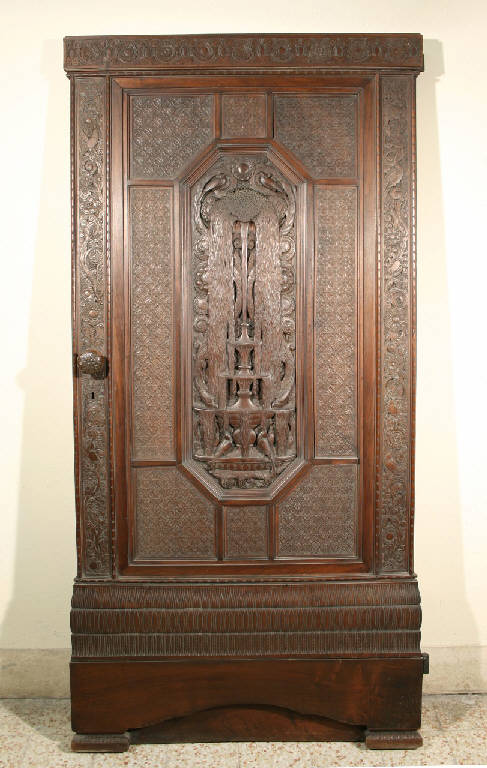 Porta in noce scolpita con motivi decorativi e floreali e pannello centrale con motivo fontana