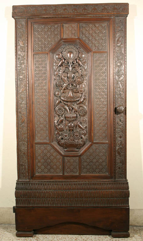 Porta in noce scolpita con motivi decorativi e floreali e pannello centrale con motivi di fiori e uccelli