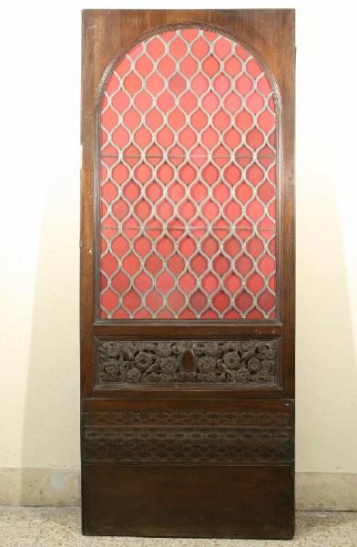 Porta in noce arcuata con vetri piombati e pannello con decorazione floreale