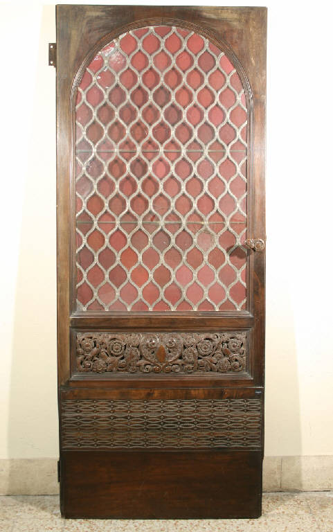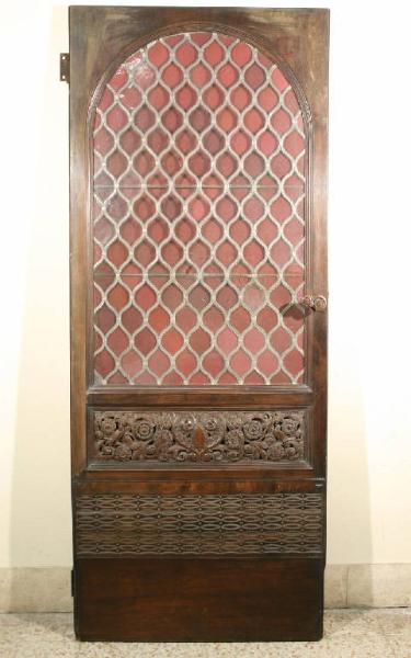 Porta in noce arcuata con vetri piombati e pannello con decorazione floreale