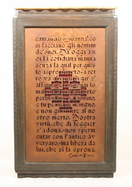 Copricalorifero in rame sbalzato con iscrizioni tratte dalla Divina Commedia e mensola in marmo