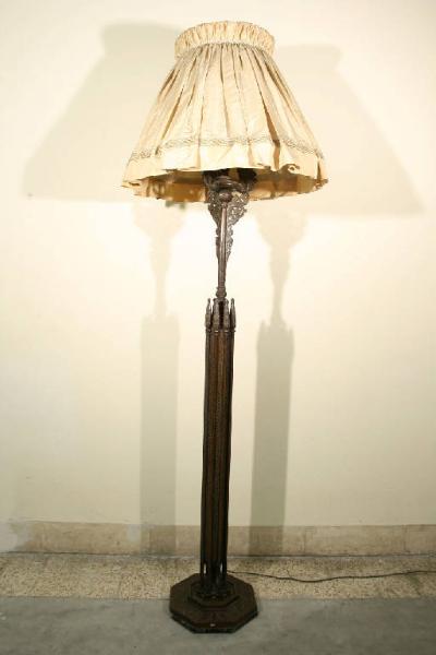 Torciera in noce con base ottagonale e otto guglie scolpite. Paralume superiore retto da quattro archi intagliati e scolpiti.