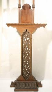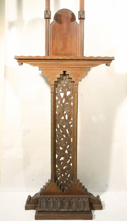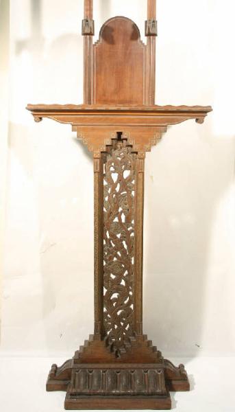 Cavalletto per dipinti in legno di noce, scolpito e intagliato con motivi floreali e ricca base scolpita.