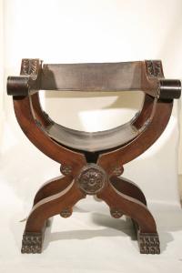 Sedia dantesca in legno di noce scolpita con rivestimento in pelle. Una rosetta di legno decora il perno frontale. I piedi della sedia sono in forma di zampe leonine