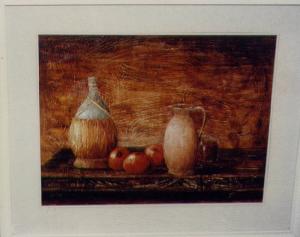 Fiasco. natura morta con frutti e bottiglie