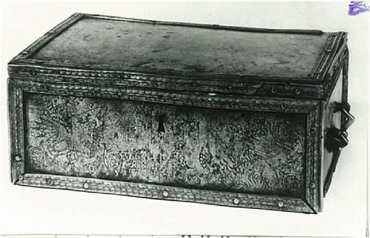 Cassetta in ferro damaschinata sui fianchi, interno in legno. Maniglie sui lati brevi e profilature in nastro metallico, decorato a motivi geometrici.