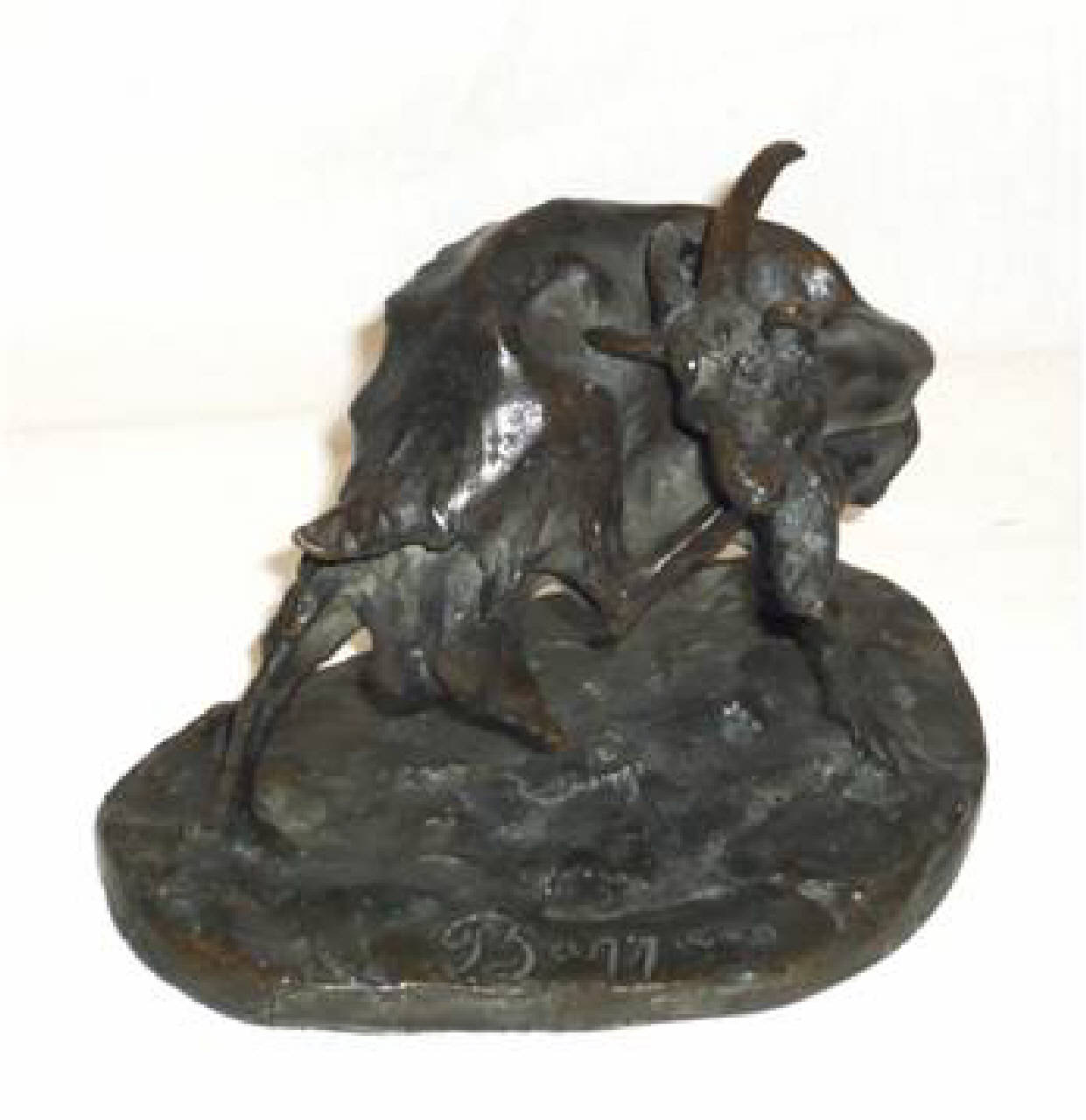 Scultura di capretta che, col muso rivolto all'indietro, si morsica la zampa posteriore destra. Base in bronzo di forma ovale irregolare.