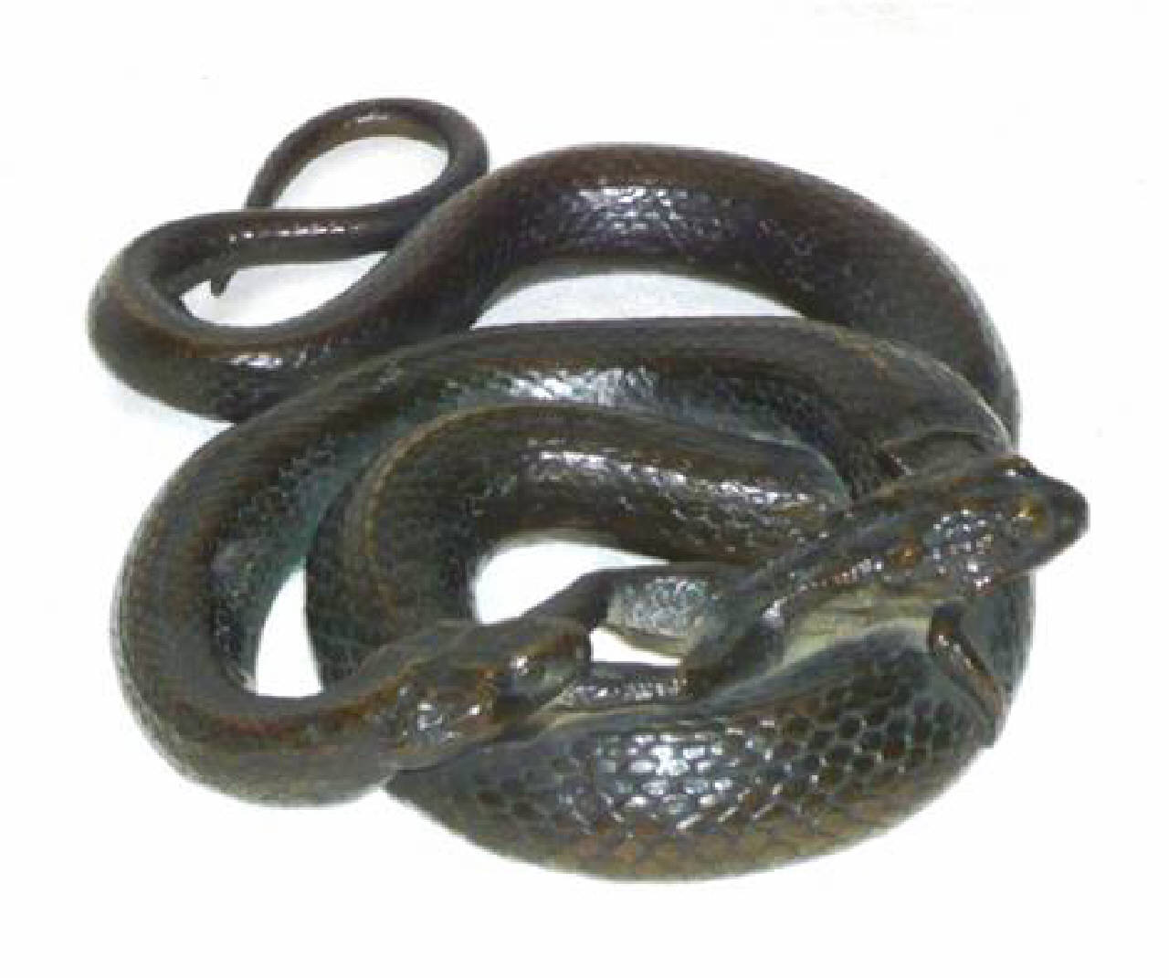 Fermacarte di bronzo a forma di serpente attorcigliato colto nell'atto di azzannare una rana.
