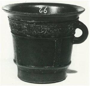 Mortaio con ansa a quattro campi lisci, delimitati da cordoni verticali, e decorato con una fascia di festoni in prossimità del bordo superiore.