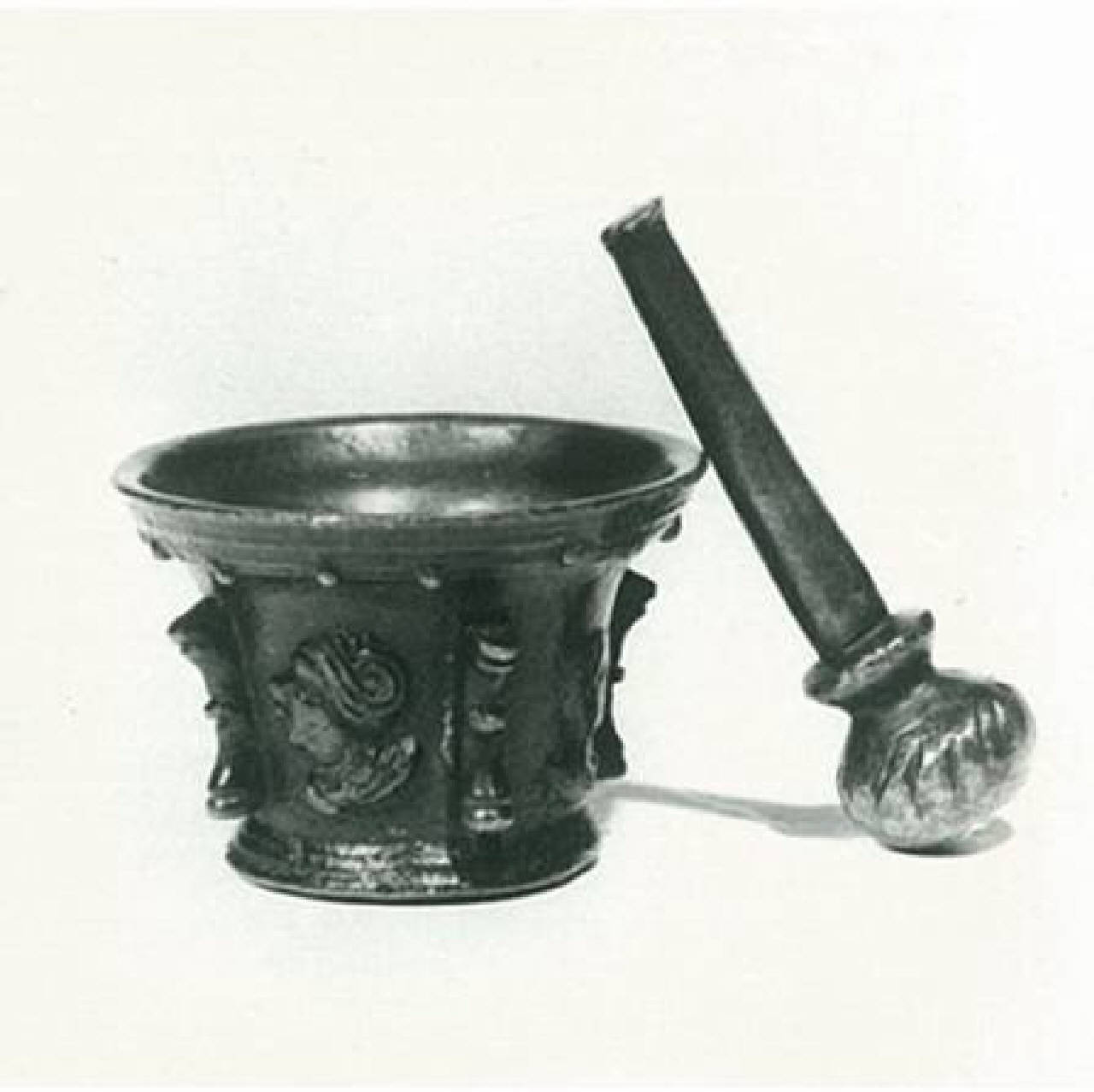 Mortaio ad orlo espanso e base svasate, con costolature ondulate verticali sporgenti. Nei quattro campi testine umane di profilo. Vi è unito anche il pestello.
