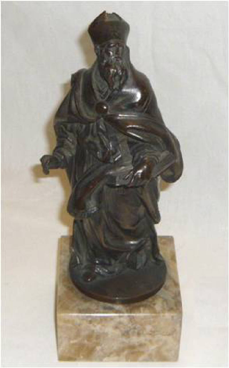 Scultura di Santo vescovo che regge nella mano sinistra un libro aperto. È coperto da un mantello abbottonato sul petto.