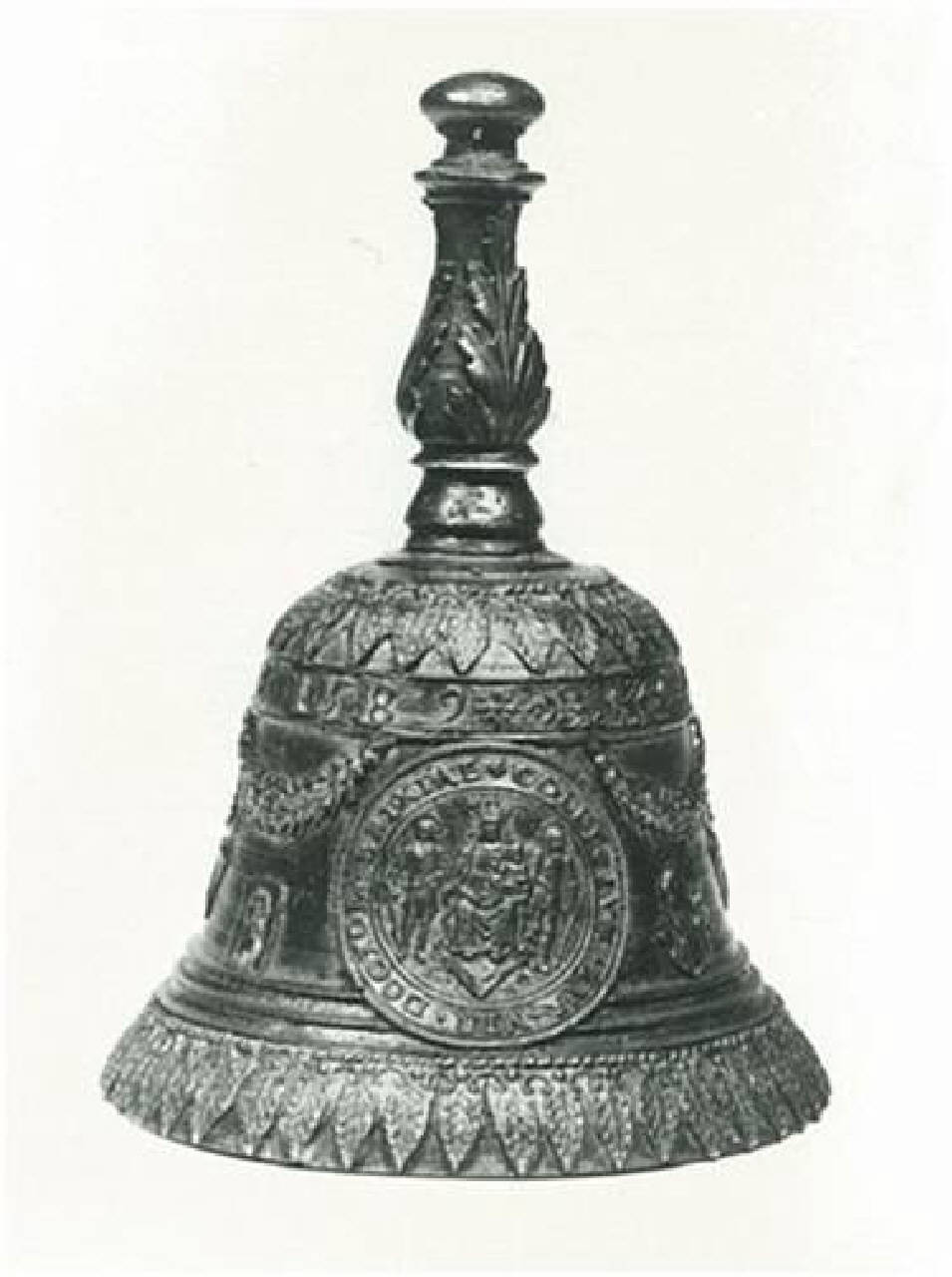 Campanello a mano decorato da fasce di foglie d'acanto sul bordo inferiore e superiore. Sul corpo due medaglioni contrapposti, che racchiudono una sacra conversazione, contornati da una scritta. I medaglioni sono intervallati da festoni e bucrani.