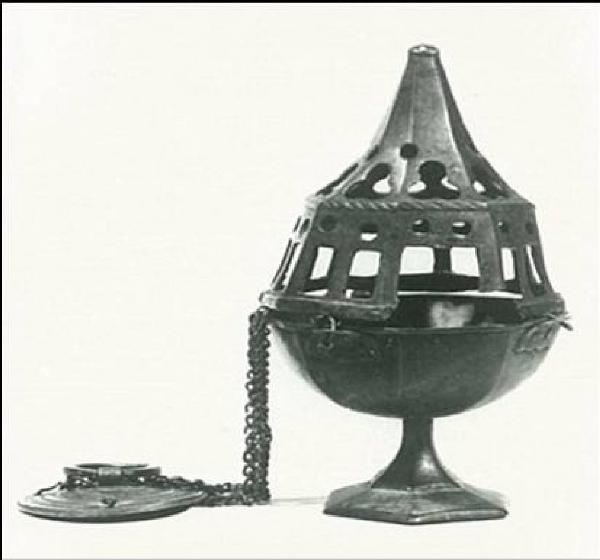 Incensiere a corpo ottagonale e a piede esagonale; coperchio a piramide esagonale decrescente coi lati traforati a rettangoli, dischi e foglie.