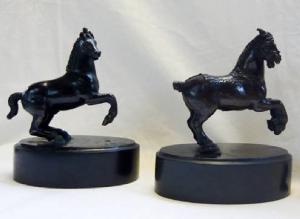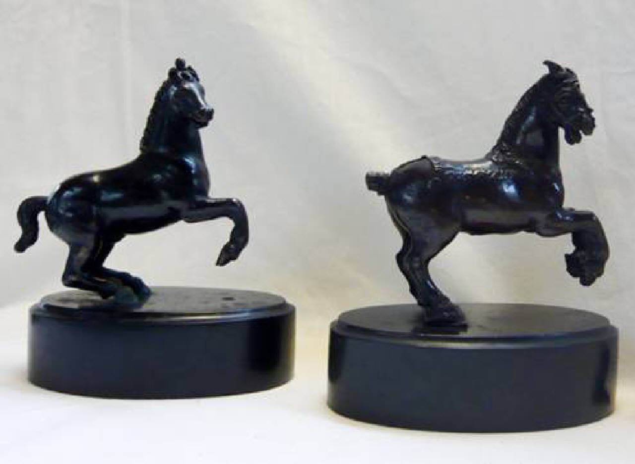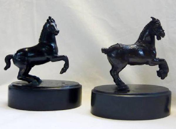 due statuette di cavalli al galoppo, con le zampe anteriori alzate; base in marmo nero.