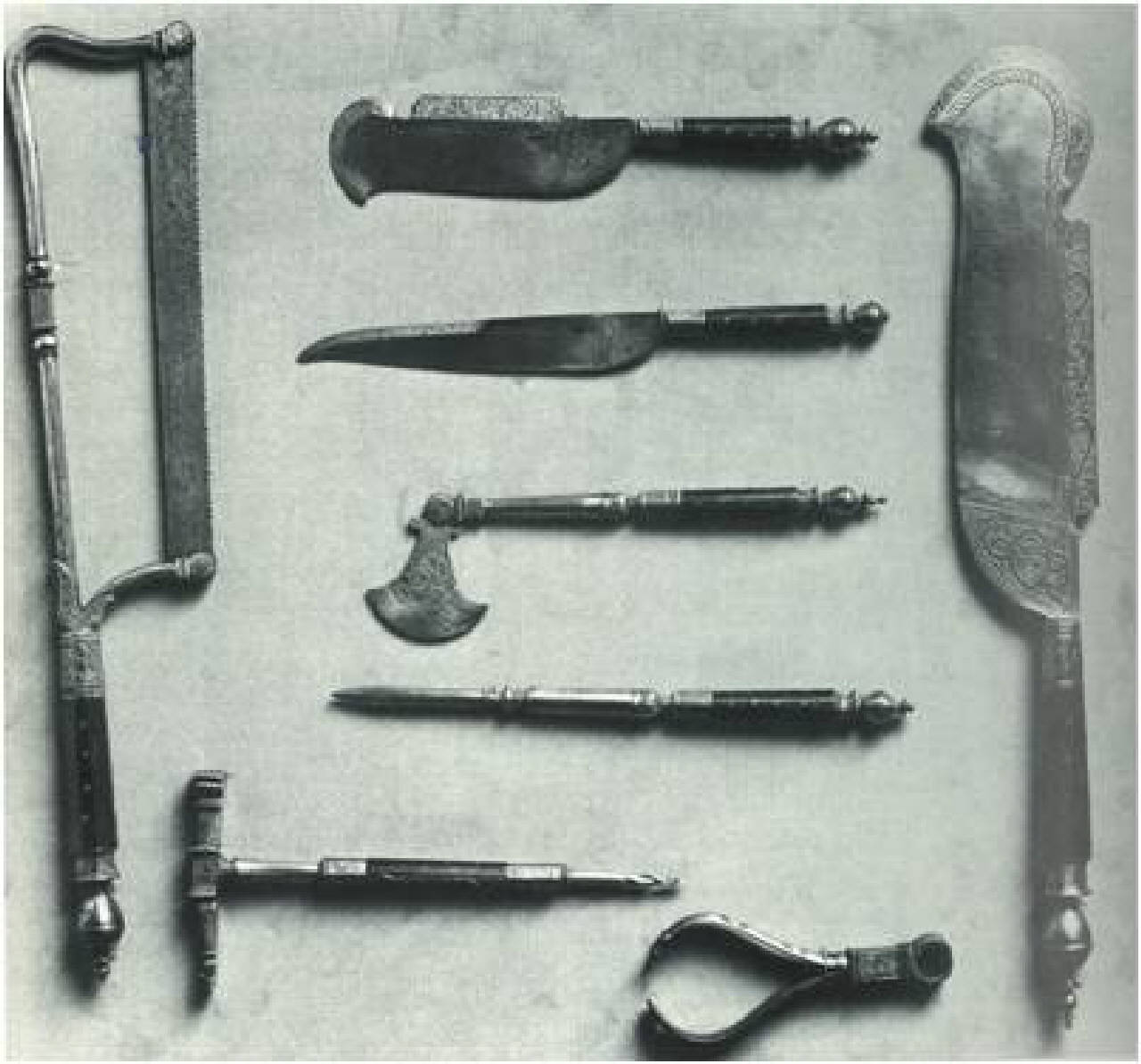 Corredo da caccia, composto di otto pezzi in metallo immanicati in legno, con fasce metalliche incise alle estremità e pomolo terminante in metallo. Sulle lame è inciso un punzone non identificato, molto probabilmente tedesco. Il set doveva essere corredato da un astuccio in cuoio grazie al quale i coltelli potevano essere portati al cinturone durante le battute di caccia.