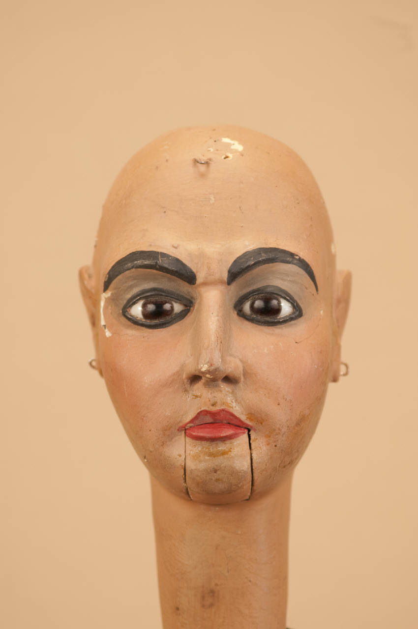 Testa in legno di tiglio con occhi di vetro. Bocca mobile con tassello dietro la nuca per la realizzazione del meccanismo.