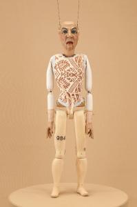 Testa di legno di tiglio fissata al corpo tramite ferro, occhi di vetro. Corpo grande in abete snodato in vita ad incastro. Gambe unite al bacino tramite bordione in ferro, ginocchia ad incastro mobile. Mani mobili in tiglio con dita scolpite e separate. Bilancino a croce metodo Holden per coppie.