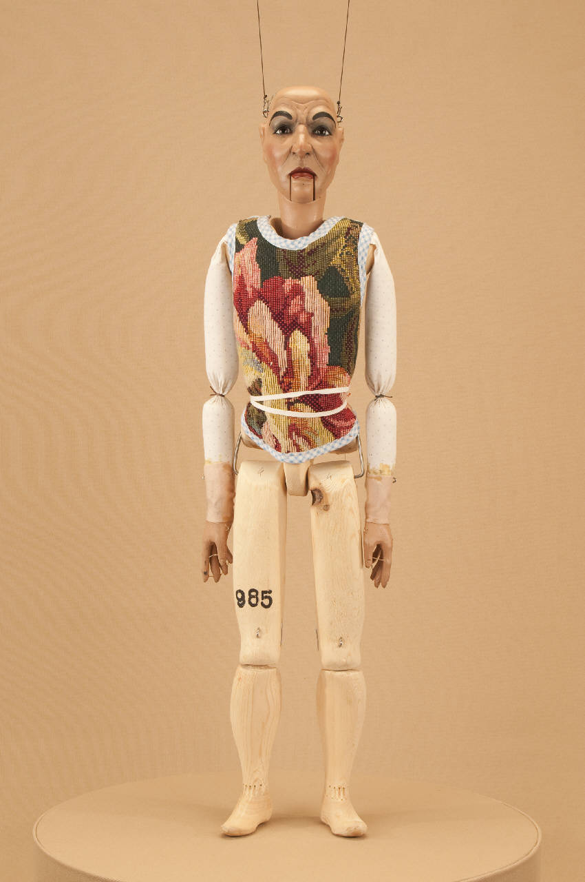Testa di legno di tiglio fissata al corpo tramite ferro, occhi di vetro. Corpo grande in abete snodato in vita ad incastro. Gambe unite al bacino tramite bordione in ferro, ginocchia ad incastro mobile. Mani mobili in tiglio con dita scolpite e separate. Bilancino a croce metodo Holden per coppie.