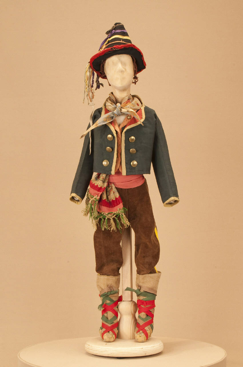 - NOTIZIE STORICO CRITICHE Il costume si completa con collo e polsi. Gli spettacoli della Compagnia Carlo Colla che trattano il tema del brigantaggio nell¿Italia settentrionale e meridionale, in cui veniva utilizzato questo costume, erano in repertorio già dal 1863, come si evince dal libro mastro 1863-1879. I titoli erano "Majno della Spinetta", "I misteri del brigantaggio" e "I briganti della Callabria"(sic). Nel 1904 quest¿ultimo diventa "Caruso e i suoi briganti". Da questo spettacolo traggono origine nel 1907 l¿azione coreografica in 7 quadri "L¿umile eroe" con la musica di Corrado Gualtieri e nel 1918 "L¿asino e il Curato", commedia in due atti, entrambe a firma di Carlo II Colla.\nIl ballo "storico patriottico" "L¿umile eroe" rientra nei progetti di informazione sugli episodi storici che caratterizzarono la seconda metà dell¿800, tema trattato da tutte le compagnie marionettistiche di giro. Ad esso si affiancava l¿indagine sui fenomeni di trasformazione sociale che seguirono l¿età risorgimentale fra cui trova spazio il fenomeno del brigantaggio nell¿Italia settentrionale e meridionale. L¿ultima replica del ballo al Teatro Gerolamo di Milano risale al 1954.