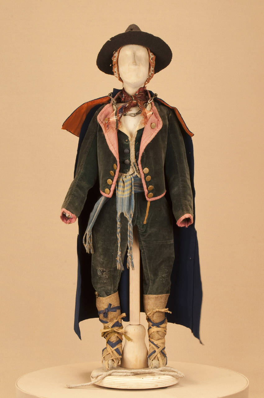 - NOTIZIE STORICO CRITICHE Dal 1978 il personaggio prende il nome di Rocco, onde evitare l'omonimia con lo statista ucciso. Il costume si completa con collo e polsi. Il mantello è stato aggiunto in un secondo momento, presumibilmente da Rosina Colla nel 1904: lo testimoniano i punti di cucitura eseguiti a macchina. Gli spettacoli della Compagnia Carlo Colla che trattano il tema del brigantaggio nell¿Italia settentrionale e meridionale, in cui veniva utilizzato questo costume, erano in repertorio già dal 1863, come si evince dal libro mastro 1863-1879. I titoli erano "Majno della Spinetta", "I misteri del brigantaggio" e "I briganti della Callabria"(sic). Nel 1904 quest¿ultimo diventa "Caruso e i suoi briganti". Da questo spettacolo traggono origine nel 1907 l¿azione coreografica in 7 quadri "L¿umile eroe" con la musica di Corrado Gualtieri e nel 1918 "L¿asino e il Curato", commedia in due atti, entrambe a firma di Carlo II Colla.\n"L¿asino e il Curato" si propone di presentare sulla scena personaggi e situazioni della realtà (il manoscritto è datato 1879) senza dimenticare gli archetipi della Commedia Latina e dei canovacci della Commedia dell¿Arte. Una particolare attenzione nel rendere, attraverso il linguaggio, i ruoli dei diversi protagonisti, un Curato, una Perpetua, un Sagrestano, dei Briganti, un Bersagliere, sullo sfondo di un solare ed immaginario paese del Meridione dopo la conquista del Regno delle Due Sicilie, ne fa uno spettacolo di particolare incidenza nel repertorio della Carlo Colla e Figli.\nL¿ultima replica della commedia al Teatro Gerolamo di Milano è avvenuta nel 1955 ed è stata presentata in più occasioni in questi ultimi anni.