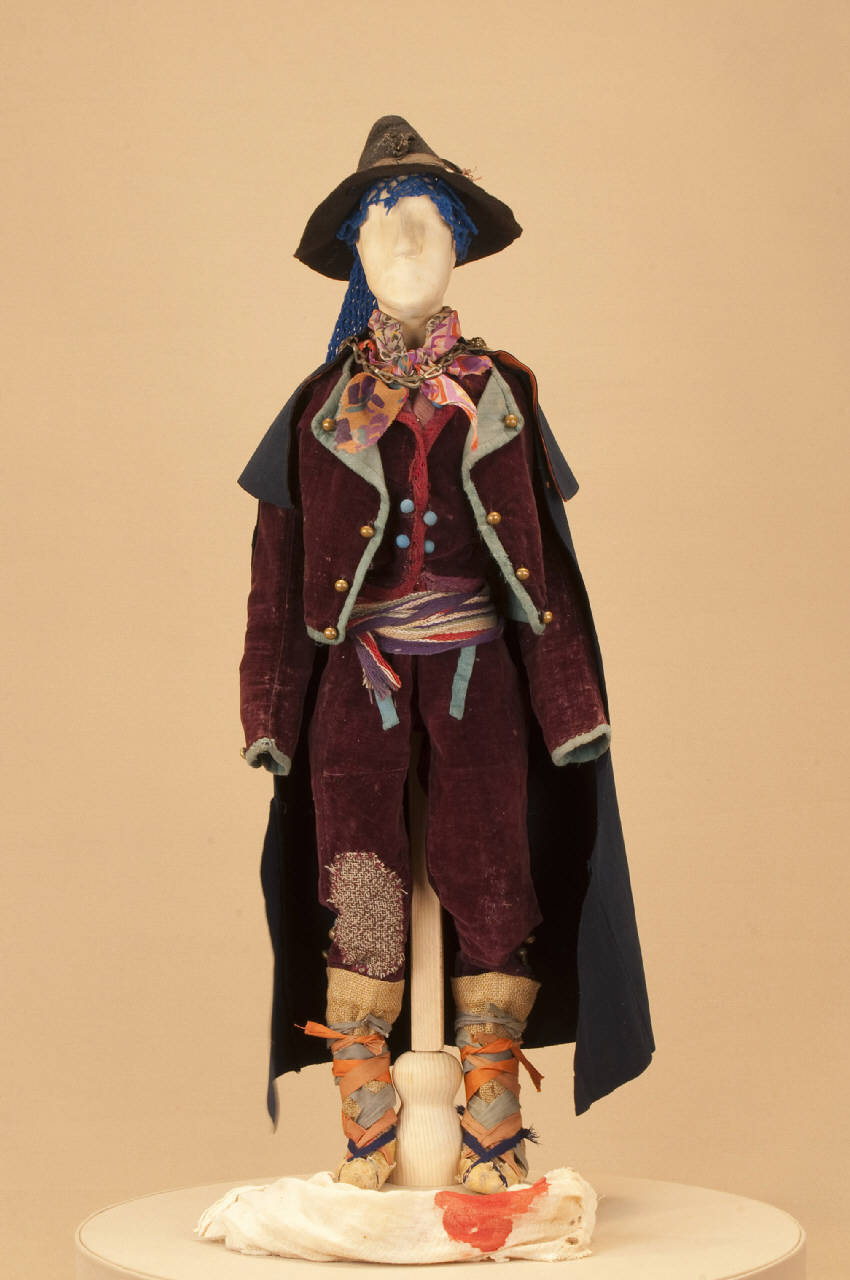- NOTIZIE STORICO CRITICHE Il costume si completa con collo e polsi. Il mantello è stato aggiunto in un secondo momento, presumibilmente da Rosina Colla nel 1904: lo testimoniano i punti di cucitura eseguiti a macchina. Gli spettacoli della Compagnia Carlo Colla che trattano il tema del brigantaggio nell¿Italia settentrionale e meridionale, in cui veniva utilizzato questo costume, erano in repertorio già dal 1863, come si evince dal libro mastro 1863-1879. I titoli erano "Majno della Spinetta", "I misteri del brigantaggio" e "I briganti della Callabria"(sic). Nel 1904 quest¿ultimo diventa "Caruso e i suoi briganti". Da questo spettacolo traggono origine nel 1907 l¿azione coreografica in 7 quadri "L¿umile eroe" con la musica di Corrado Gualtieri e nel 1918 "L¿asino e il Curato", commedia in due atti, entrambe a firma di Carlo II Colla.\n"L¿asino e il Curato" si propone di presentare sulla scena personaggi e situazioni della realtà (il manoscritto è datato 1879) senza dimenticare gli archetipi della Commedia Latina e dei canovacci della Commedia dell¿Arte. Una particolare attenzione nel rendere, attraverso il linguaggio, i ruoli dei diversi protagonisti, un Curato, una Perpetua, un Sagrestano, dei Briganti, un Bersagliere, sullo sfondo di un solare ed immaginario paese del Meridione dopo la conquista del Regno delle Due Sicilie, ne fa uno spettacolo di particolare incidenza nel repertorio della Carlo Colla e Figli.\nL¿ultima replica della commedia al Teatro Gerolamo di Milano è avvenuta nel 1955 ed è stata presentata in più occasioni in questi ultimi anni.