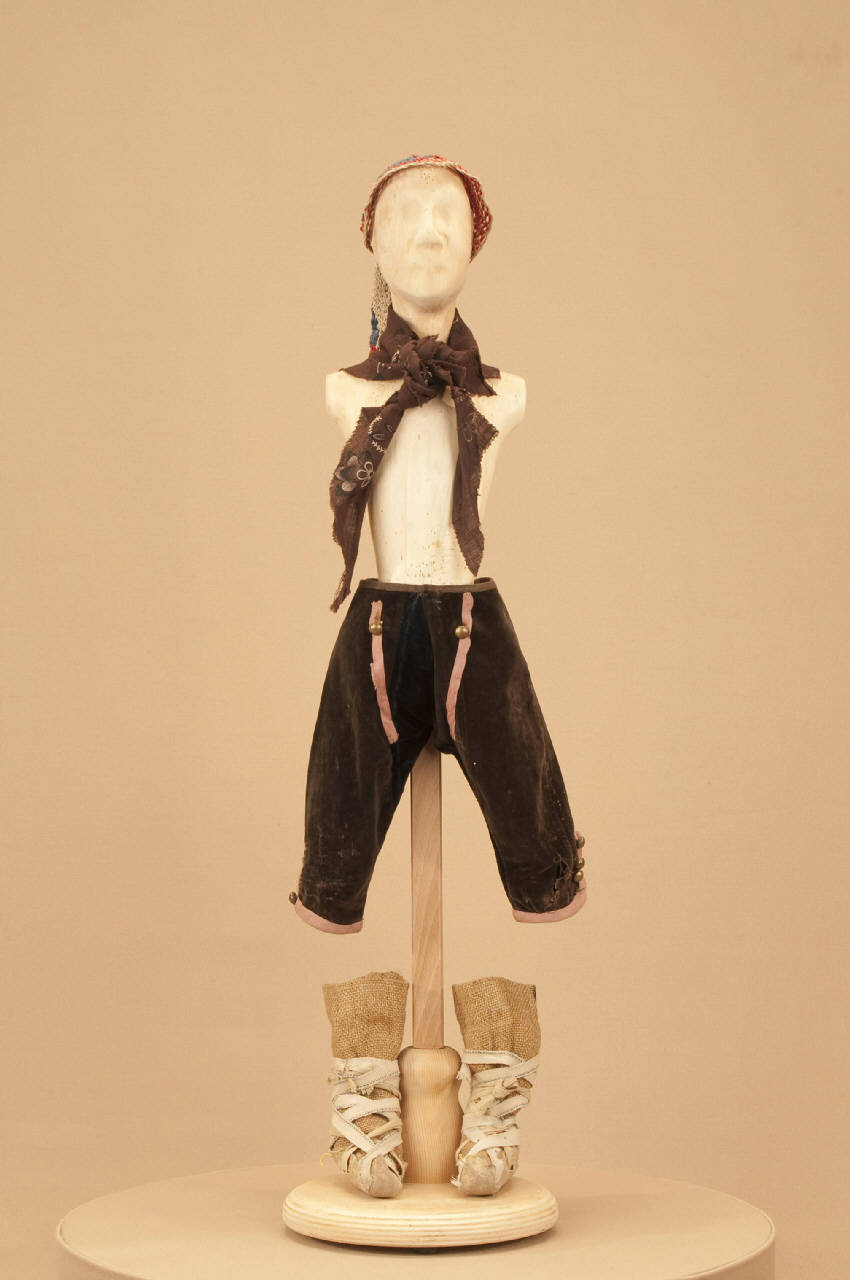 Costume da popolano di foggia ottocentesca composto da pantaloni, fazzoletto da collo, reticella e ciocie.