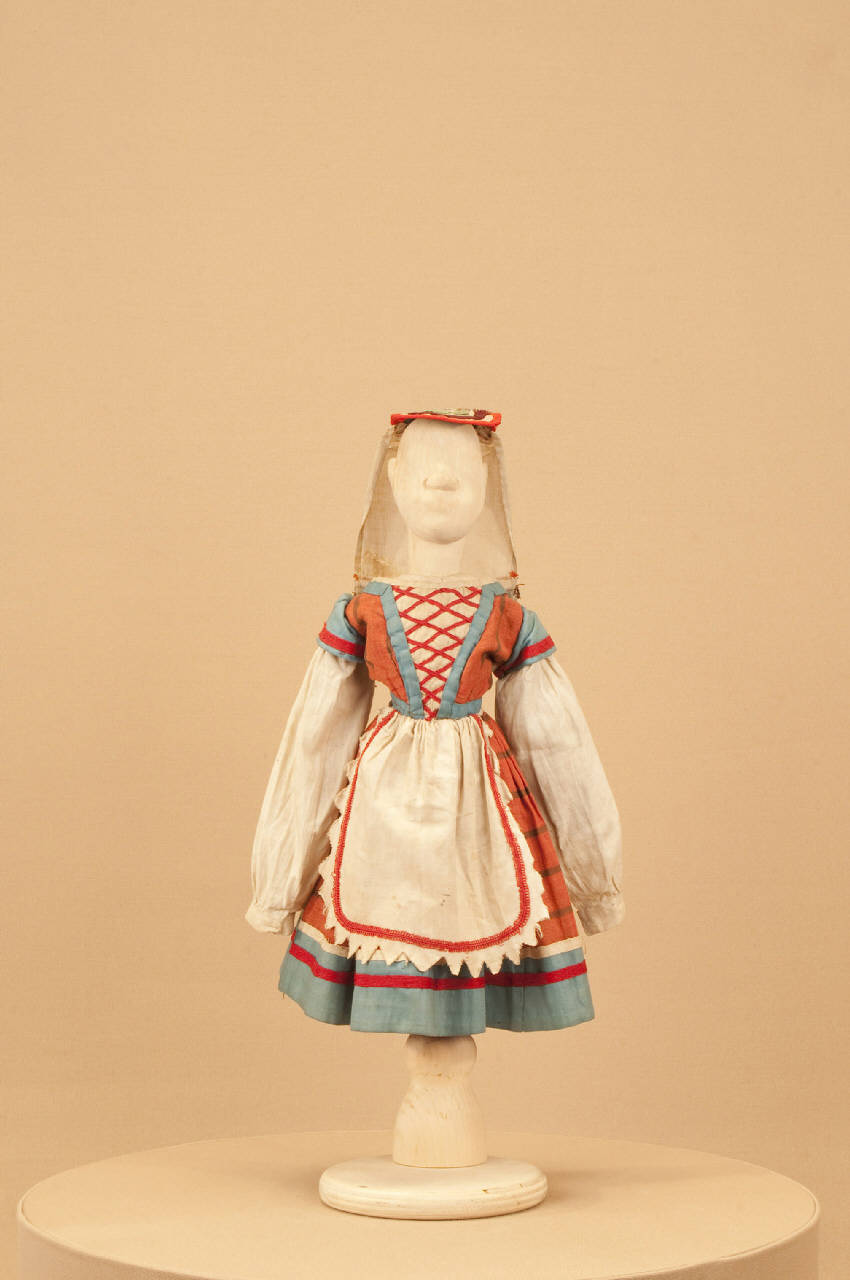 Costume da bambina popolana di foggia ottocentesca composto da veste e copricapo.