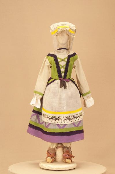 Costume folcloristico da donna italiana composto da veste, ciocie e copricapo.