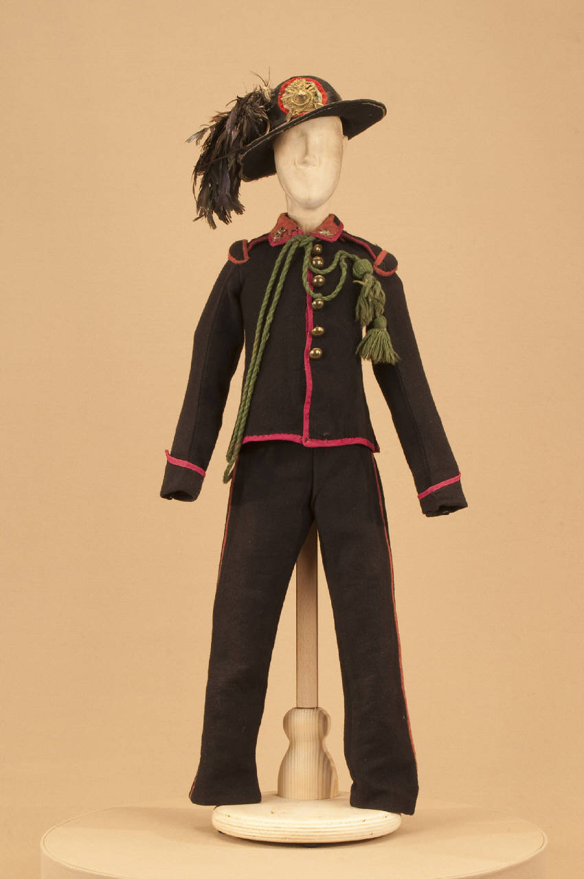 Costume militare da bersagliere composto da pantaloni, giacca, cappello e cordone.
