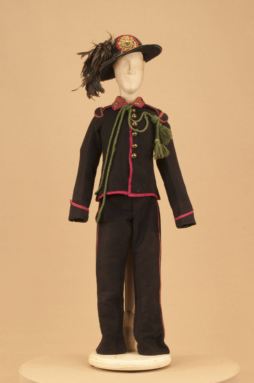 Costume militare da bersagliere composto da pantaloni, giacca, cappello e cordone.