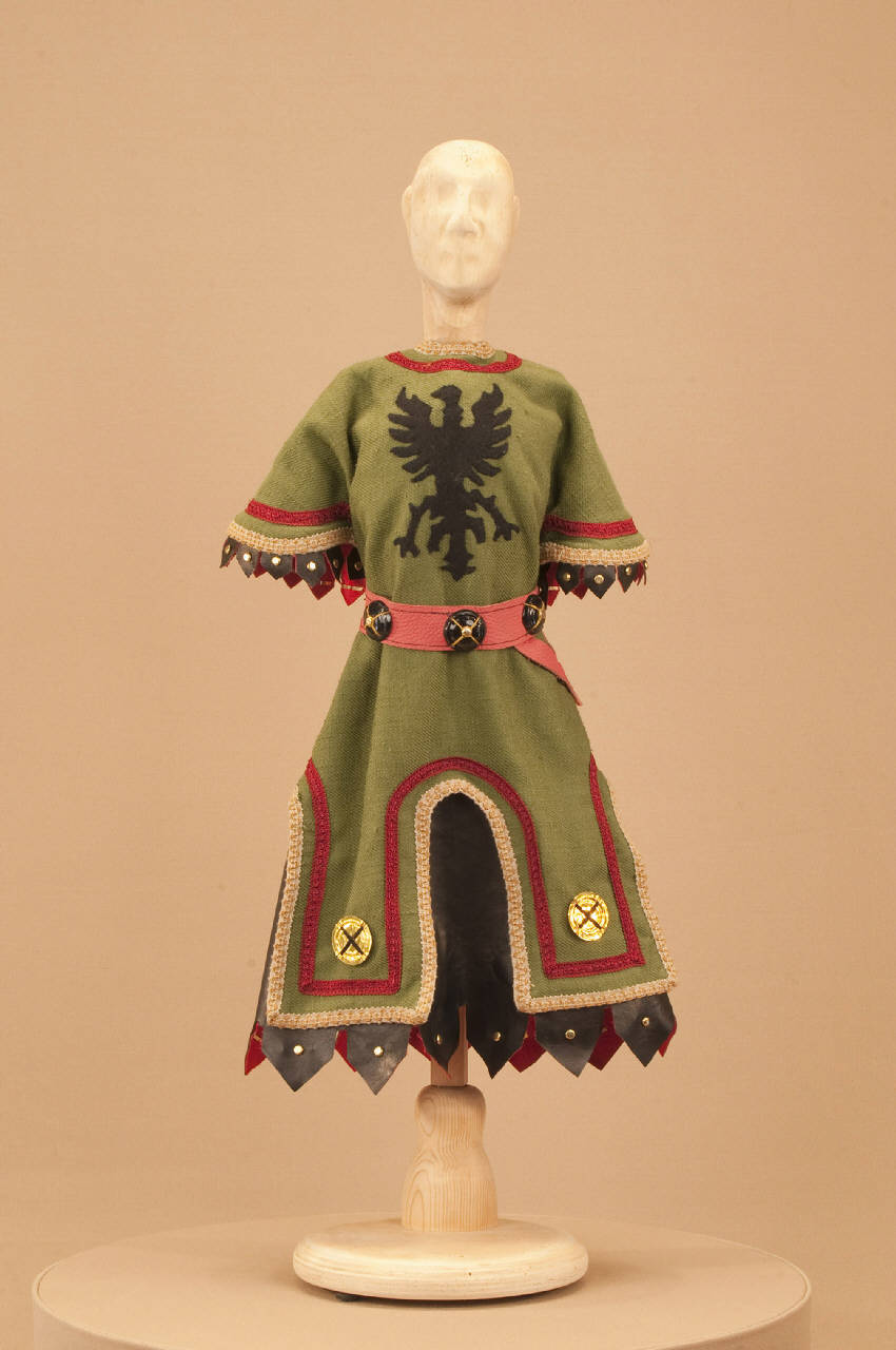 - NOTIZIE STORICO CRITICHE Il costume, che si completa con calzamaglia di cotone, con bracciali di pelle, con calze, maniche e cuffia in maglia di ferro, è stato realizzato per "La Battaglia di Legnano", dramma lirico di Salvatore Cammarano con musica di Giuseppe Verdi andato in scena per la prima volta nel 1849 e per l¿apertura della stagione al Teatro alla Scala nel 1961 in occasione delle manifestazioni per celebrare il Centenario dell¿Unità d¿Italia, entra nel repertorio della Compagnia Marionettistica Carlo Colla e Figli nel maggio 1992, commissionata dalla cittadina lombarda in questione in occasione delle celebrazioni dell¿evento storico. Patria, onore, sacrificio di sé, libertà, si mescolano ad una vicenda amorosa di maniera dove, però, appaiono temi che in opere successive troveranno più ampio respiro. Per il riallestimento del 2012 al Piccolo Teatro di Milano, sono stati realizzati nuovi costumi, su ideazione di Eugenio Monti Colla e Cecilia Di Marco, e scene da Franco Citterio. I siparietti utilizzati sono siparietti storici, realizzati da Alessandro Colla nel 1932.