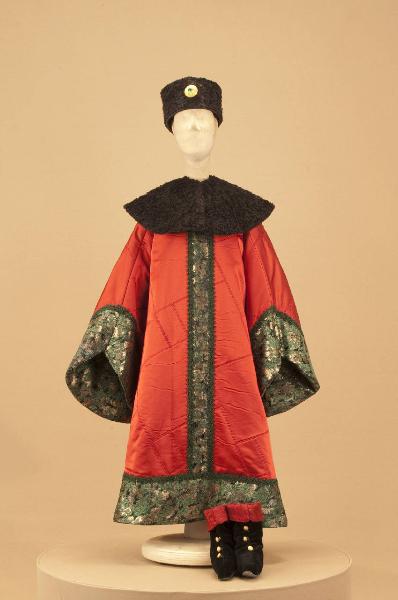 Costume da nobile medievale composto da veste, collo, scarpe, calze e cappello.