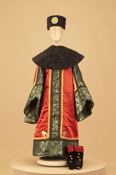 Costume da nobile medievale composto da veste, collo, scarpe, calze e cappello.