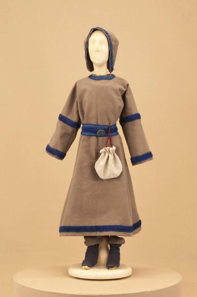 Costume da popolano medievale composto da veste, cintura (con borsetta), scarpe e cappello.