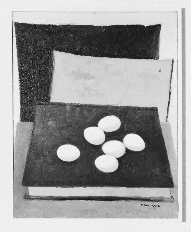 - NOTIZIE STORICO CRITICHE Il dipinto è un 'divertissement' cromatico. Sei uova candide sono appoggiate sulla copertina nera di un libro, appoggiato su un tavolino, accostato a due cartoni appoggiati a loro volta alla parete. La scena, giocata cromaticamente solo su quattro colori, è costruita mediante la sovrapposizione di campiture cromatiche contrastanti nell'intento di suggerire una profondità spaziale basata sul colore e non sulla prospettiva geometrica lineare. Anche il chiaroscuro è assente e le volumetrie sono rese con lievissime variazioni tonali. Il tema della natura morta di uova è ricorrente nella pittura di Casorati, presente nella sua opera fin dal 1914 con il dipinto "Le uova sul tappeto verde". E' quasi un omaggio a Piero della Francesca, a cui sempre Casorati guardò per la costruzione matematica dello spazio e per l'atmosfera assorta e immobile. L'uovo dalla forma perfetta e dalla fragile consistenza permette, inoltre, all'artista una riflessione sul contrasto tra la precarietà e la solidità formale. Il "realismo magico" di Casorati degli anni '20 andò stemperandosi, a partire dalla fine degli anni '30, in una riflessione più intimista e accorata tendendo successivamente verso una neutralità spoglia e una essenzialità minimale, in cui la prospettiva e la volumetria si appiattiscono.