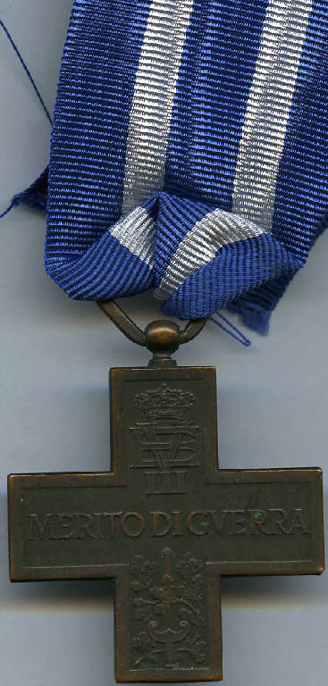Croce al Merito di Guerra. "Merito di guerra" tra monogramma di Vittorio Emanuele III e gladio romano con serto d'alloro; stella raggiata a cinque punte